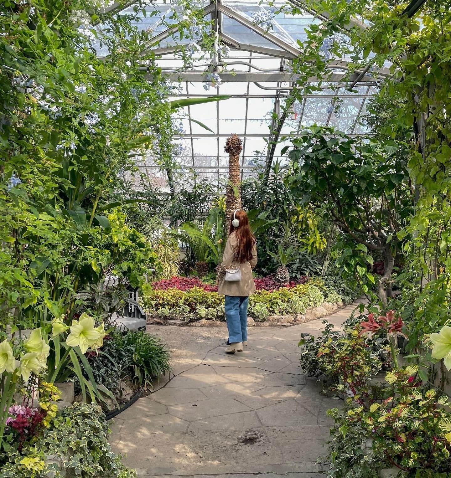 When the city is grey and cold, the conservatory offers a burst of color and life. The warm, lush plants inside create a great contrast with the snow visible through the glass panes.