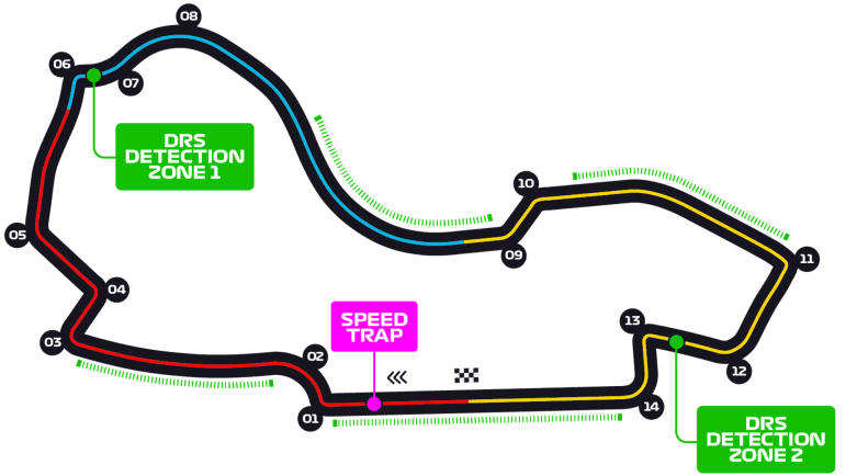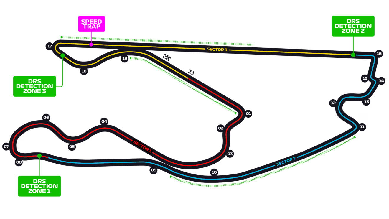 The Miami Grand Prix, held for the first time in 2022, is a thrilling street circuit around Hard Rock Stadium. The 5.41 km track features 19 turns, three straights, and potential three DRS zones, with top speeds of more than 320 km/h. The track includes dramatic elevation changes, particularly between Turn 13 and Turn 16, where the track goes over an exit ramp and flyovers. The Turn 14-15 chicane has a difficult uphill run-up, cresting then dropping on exit, to provide even more excitement for this outstanding race.