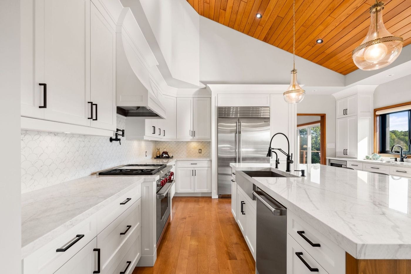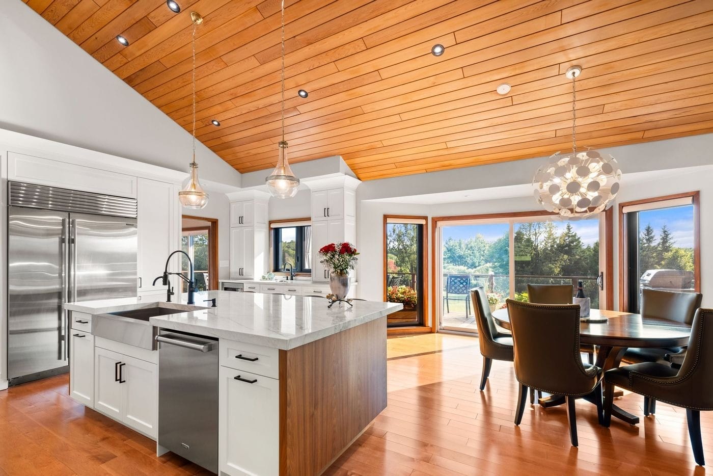 - Kitchen: The kitchen is sleek and functional, with white cabinetry, stainless steel appliances, and a large island, perfect for family meals or hosting friends.